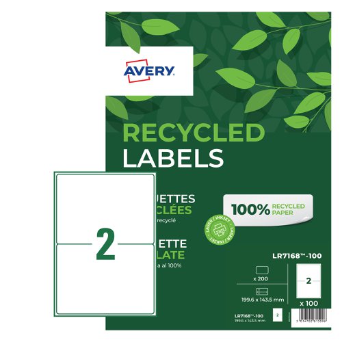 With Avery QuickPEELô recycled parcel labels you can make a difference and help to protect the environment. Not only are these labels made from 100% chlorine-free, bleached recycled paper but during the manufacturing process any waste material is completely recycled. Both the labels and packaging can be recycled with normal office waste.These recycled labels are guaranteed JamFREEô ensuring they run smoothly through your laser printer every time and also include the Avery QuickPEELô technology for faster application. Simply divide the sheet of labels along the perforation to expose the label edges and then peel and apply. Ideal for addressing envelopes, parcels and tubes as well as organising and filing. The label format is 199.6 x 143.5mm with 2 labels per sheet and is an ideal size for applying to large parcels. Also great for many E-commerce platforms. Send the right message with a neatly printed label using Avery Design & Print, free template software where you can personalise your labels with company logos and business branding. Here youíll also find free warning label templates, including ëfragileí and ëthis way upí, to help keep your parcels safe on their journey.