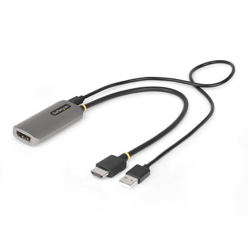Extended Cables This HDMI to DP adapter features a 1ft (30cm) cable between the HDMI and DP connectors, reducing strain on ports and connectors. The adapter includes a 1.6-foot (50cm) USB power cable for connecting to a powered USB port anywhere on the laptop or to a USB wall charger. Power is required for the adapter to function.