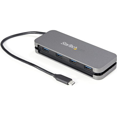 This 4 Port USB-C Hub enables you to connect four SuperSpeed USB 3.2 Gen 1 (5 Gbps) peripherals to your USB-C laptop or computer, an ideal solution for adding USB ports to a device that has limited USB ports available. It features a wrap-around cable manager, allowing you to tuck away the built-in cable for easy portability. With this USB-C hub you can connect four USB-A devices to a single USB-C port on your USB-C host device. The USB Type-C hub shares up to 15W (5V/3A) of power between connected devices, making it an ideal solution for connecting SSD/thumb drives, data storage, keyboards, mice, web cams and USB headsets. The USB hub is backward compatible with USB 2.0 (480 Mbps). Featuring a durable plastic housing that's lightweight, and a sleek wrap-around cable management system, this USB hub is the perfect travel companion for your laptop. Its small footprint ensures it will store easily in your laptop bag, and the wrap-around cable manager prevents tangles, ensuring easy accessibility. The USB hub is bus powered so there's no bulky external power adapter. The USB hub is OS independent ensuring support on a wide range of platforms including Windows, macOS, Linux, iPadOS, Chrome OS and Android. The built-in host cable is 11 in. (28 cm) long, providing enough length to easily integrate into any workstation, reaching your host device even when it's placed on a laptop riser or stand. The USB-C host connection works with any USB-C or Thunderbolt 3 laptop, tablet, smartphone or 2-in-1, such as Surface Pro 7, Surface Book, iPad Pro, MacBook/MacBook Pro/MacBook Air, XPS or X1 Carbon.