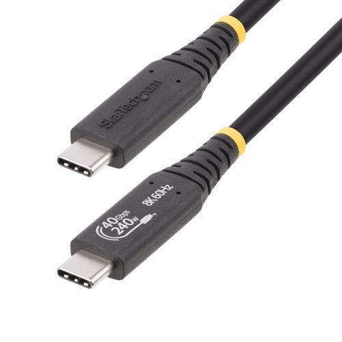 Connect reliably to USB Type-C (USB4), Thunderbolt, and PCIe-enabled devices, delivering up to 40Gbps, 8K/4K video, and 240W of Power Delivery. The connector markings enable quick visual identification, distinguishing this USB4 cable from other similar-looking or unmarked USB-C cables. Eliminate guesswork and always choose the appropriate cable to support full USB4 capabilities. The USB4 Charger Cord supports up to 240W of Extended Power Range (EPR) Power Delivery 3.1. It is ideal for high performance USB-C laptops requiring extra power, such as 16in MacBook Pro M3 Pro/M3 Max. Connect the cable from the laptop to a USB-C wall charger or compatible docking station. This USB4 Type-C cable is USB-IF certified for guaranteed USB-C compatibility. It reliably delivers consistent transfer rates and power output. It facilitates 40Gbps data transfer to external USB-C-enabled external storage devices or serves as a single-cable connection from a USB-C dock to a laptop. This cable has undergone rigorous USB-IF compliance testing to meet USB4 specifications. This includes electrical and mechanical standards which ensure a reliable, high-quality cable for USB-C devices. StarTech.com's cables are designed to meet the technical requirements of wide variety of applications. Our in-house specialists subject our products to multiple rounds of comprehensive testing for interoperability and reliability with the latest devices. The USB4 cable supports up to 8K 120Hz or 4K 240Hz video over DisplayPort 1.4 Alt Mode with DSC, HDR, and HBR3, and is compatible with 4K 60Hz and lower resolutions.