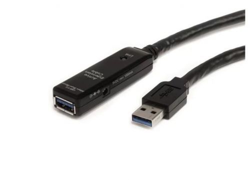 Extend the distance between a computer and a USB 3.0 device by an additional 5 metres. The USB3AAEXT5M, 5-metre Active USB 3.0 Extension Cable, offers one USB type-A (male) connector and one USB type-A (female) connector, and provides an active extension of USB 3.0 devices of up to 5-metres (16-feet). An all in one cable for overcoming distance restrictions as well as power source limitations; the active USB 3.0 extension cable incorporates bus powered active circuitry to ensure performance beyond the length limits of standard USB cables. Up to 4 of these cables can be daisy-chained together, allowing the connection to be extended a total of 20-metres. If necessary, the USB device can be powered from a wall outlet using the Universal AC power adapter provided with the cable. The USB3AAEXT5M extension cable (USB Extender) supports high speed USB 3.0 transfer rates of up to 5Gbps, and is backed by StarTech.com's 2-year Warranty.
