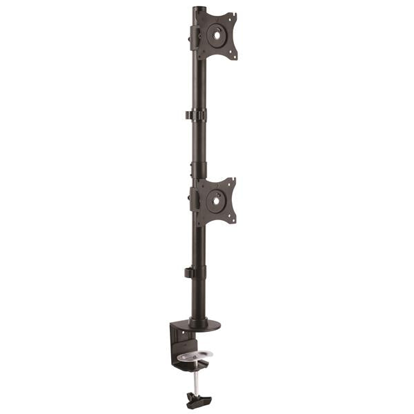 Configure your Displays to Enhance Productivity The vertical dual-monitor mount holds two displays, one above the other, in a vertical configuration. The height of the monitors can be adjusted, along the 27.5"" (700 mm) pole. With the double monitor arm, you can work more comfortably, reducing neck and eye strain without having to look side to side when comparing files or reviewing reference material on your screens. Itís ideal for comparing spreadsheets, web design, coding, creating and reviewing files, and many others. Adjust your Screens for Ideal Viewing The adjustable monitor stand enables smooth, effortless +45/-45 degree tilt and +45/-45 degree swivel, making it easy to reduce glare and find the perfect viewing angle. It can also rotate a full 360 degrees giving you flexible viewing options. Rugged Steel Design The steel dual monitor arm supports monitors 13"" to 27"" each in size, or ultrawide monitors up to 34", with a maximum weight of 22.1 lb. (10 kg) per monitor. The surface finish features a powder coating to help resist scratches. Easy Installation The computer monitor mount makes it easy to mount your VESA mount compatible displays above your desk, using the included C-clamp or grommet mount. For easier mounting, the VESA mount features notches that let you pre-set the mounting screws. Cable clips keep your cables neatly out of sight. ARMDUALV is backed by a StarTech.com 5-year warranty and free lifetime technical support.