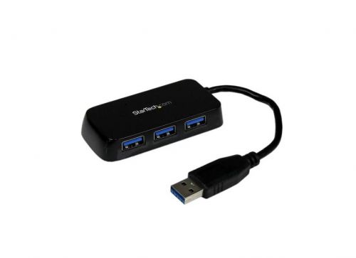 Add four external USB 3.0 ports to your notebook or Ultrabookô with a slim, portable hub. The ST4300MINU3B Portable 4 Port SuperSpeed Mini USB 3.0 Hub (Black) lets you expand your USB connectivity by turning a single USB 3.0 port into four external USB 3.0 ports. The integrated cable design makes this mini USB hub the perfect accessory for your MacÆ / PC notebook or Ultrabookô computer. The 4 Port USB 3.0 hub supports USB 3.0 data bandwidth (5 Gbps - up to 10x more than USB 2.0) and is backward compatible with USB 2.0 and 1.1 devices, ensuring flawless performance from all of your USB peripherals/devices, regardless of their age. Ideal for home and business users who require portability, the external USB 3.0 hub is USB-powered and features a rugged, compact design with a built-in cable so no additional cables are needed to connect the hub to your system. Backed by a StarTech.com 2-year warranty and free lifetime technical support.